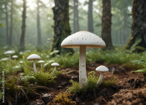 White mushroom growing in natural habitat on plantation, agricultural land, agribusiness, non-toxic, fungus growth