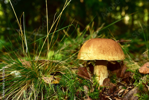 White mushroom in the forest against the background of green vegetation. Awesome boletus grows in wildlife. Porcini bolete mushrooms. Season for picked gourmet mushrooming