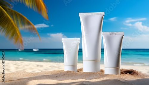 white packaging cream tubes in various shapes on sandy beach