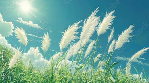 grass, pampas, white, sunny, sky, cloud, blue, green, field, nature, summer, sunlight, light, plant, floral, flora, beauty, serene, peaceful, calm, tranquil, landscape, scene, bright, day, vibrant, aesthetic, whimsical, dreamy, artistic, illustration, artwork, image, picture, background, design, texture, pattern
