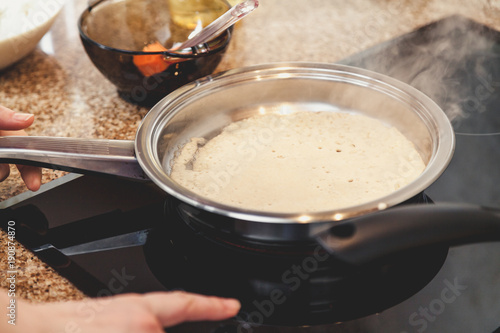 battercake, frying pan, stove, fries, treat, traditional, dish, cookery, celebration, adieu, winter, meeting, spring, round, tasty, useful, mistress, metal, clean, cooking, food, receipe, ingredient, home, work, appetence, utensil, closeup, black, cook, modern, surface, preparation, soft, empty, layer