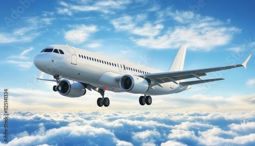 White Passenger Airplane Takes Flight, Soaring Through a Picturesque Blue Sky Above the Clouds