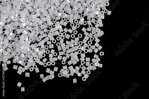 White pearls on the black background. Composition of different shaped natural fresh water pearls.
