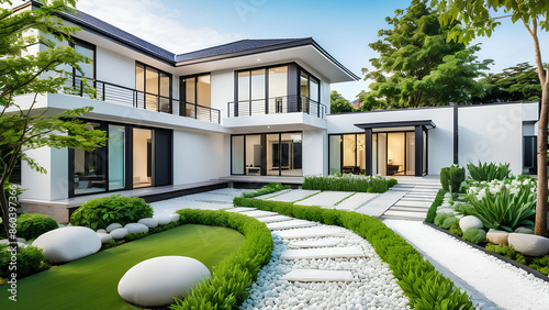 garden design, house, home, architecture, building, exterior, residential, garden, lawn, family, construction, estate, front, sky, real estate, grass, luxury, roof, window, new, residence, suburban, window, tree, property, yard