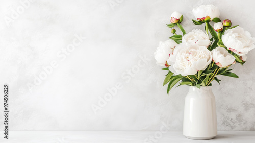 white peony bouquet in a ceramic vase on a grey background with copy space