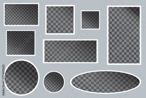 White photo frames of different size and shape with transparent space inside. Vector design elements each isolated