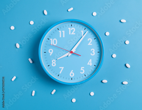 medicine, pill, disease, clock, time, tablet, blue, concept, hours, capsule, pharmaceutical, pharmacy, watch, drug, health, health care, medication, treatment, white, vitamin, alarm, care, hospital, schedule, remedy, second, minute, healthy, reminder