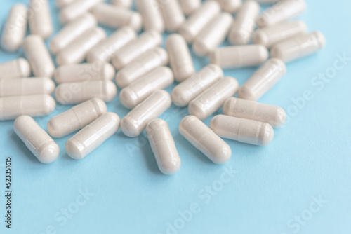 white pills on blue table. Medical, pharmacy and healthcare concept. Copy space. Place for text or logo. Mock up for special offers as advertising or other ideas.
