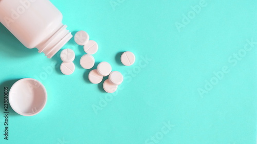 white pills scattered on a blue background. pills spilled out of the bottle. copy space for text