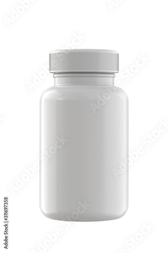 White Plastic Bottle for Pills Packing. 3D Render Isolated on White Background.