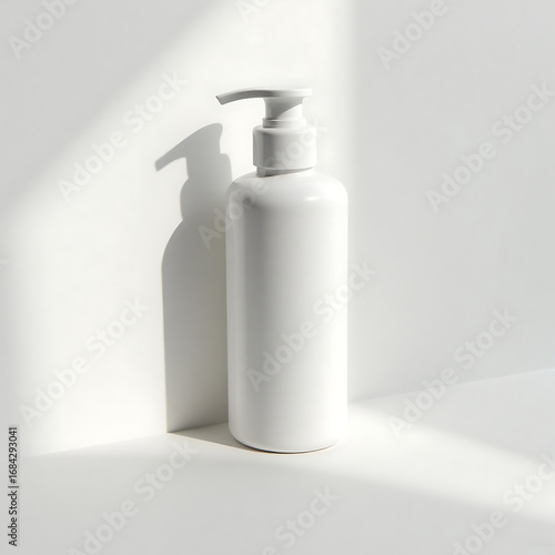 White Plastic Pump Bottle on Bright Minimalist Surface in Natural Light