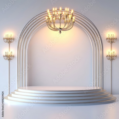 white, platform, gold, chandelier, candle, light, background, stage, product, display, minimalist, modern, elegant, luxury, arch, curve, circle, design, interior, decoration, style, abstract, shadow, shine, round, shape, space, blank, empty, three-dimensional, render, graphic, art, visual, illustration, concept, idea