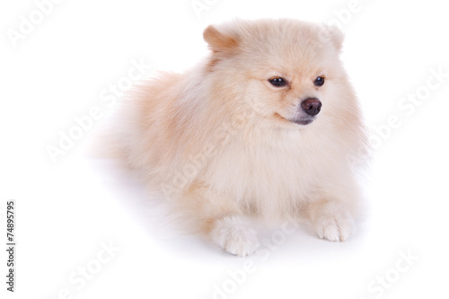 dog, pomeranian, white, isolated, background, hair, pet, puppy, happy, grooming, animal, cute, face, to sit, small, smile, miniature, fluffy, puppy, young, ear, eye, nose, leg, moustache, mouth, tongue, little, spitz, looking, barking, laying