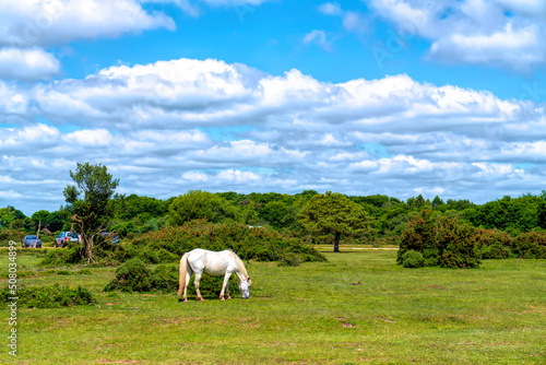 white, pony, grazing, new, forest, hampshire, animal, beautiful, blue, country, countryside, england, equine, field, grass, graze, green, horse, kingdom, landscape, farm animal, mane, mare, meadow, nature, new forest, outdoors, pasture, peaceful, pony, riding, rural, scene, sky, travel, britain, united, water, wildlife, brown, closeup, wild