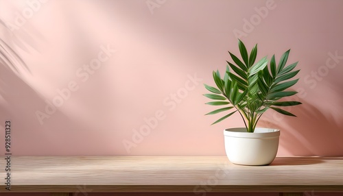 White potted plant site on wooden table on soft pink background.