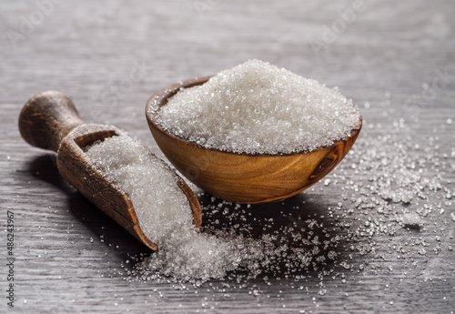 White refined sugar in wooden bowl and spoon on dark wooden table.