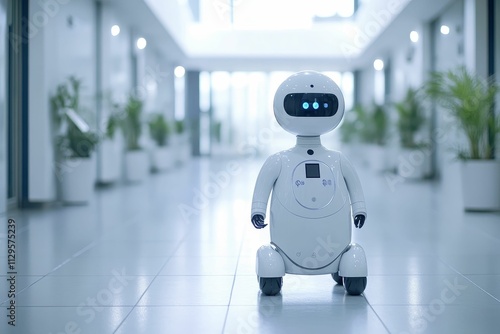 robot, automation, technology, futuristic, ai, artificial, intelligence, machine, digital, modern, white, sleek, smooth, round, wheel, hallway, corridor, interior, office, building, clean, sterile, bright, light, floor, tile, shiny, display