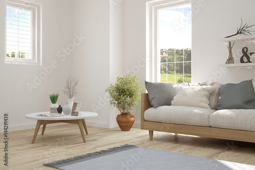 White room with wooden sofa and green landscape in window. Scandinavian interior design. 3D illustration