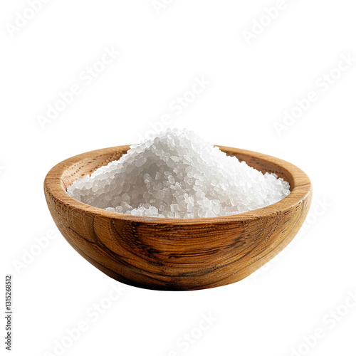 White salt spice in a wooden bowl PNG, transparent isolated background. Cooking seasoning ingredient, food flavour graphic element presentation