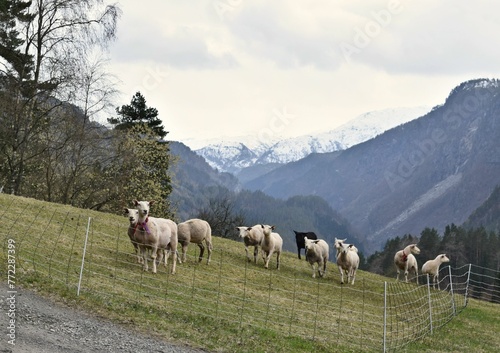 sheep, white, green, field, mountain, snow, majestic, lush, grazing, meadow, countryside, farmland, nature, horizon, pasture, scenic, peaceful, calmness, view, sky, serene, rural, pastoral, sunny, summer, blue, flora, fauna, wildlife, rolling, grassy, huge, calm