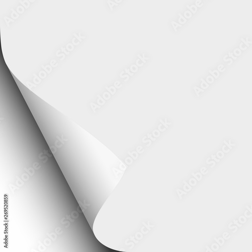 White sheet of paper with lower left paper curl. Vector paper mock up.