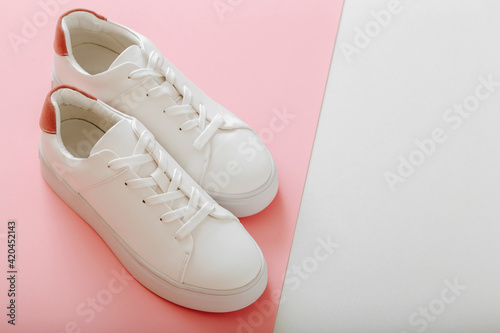 White sneakers on color pink background. Female white leather shoes with laces on pink background with copy space. Pair of stylish sneakers Comfortable sportswear hipster womens shoes.