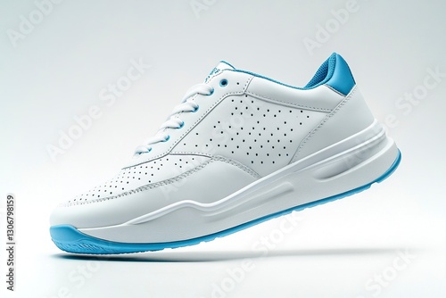 White sneakers with blue accents, low-top design, featuring intricate details and soft white and light-blue colors on an isolated background.