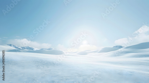 WHITE SNOW IN SUN LIGHT ON LIGHT BLUE FROSTY SKY BRIGHT WINTER BACKDROP BACKGROUND WITH EMPTY SNOWY FIELD SPACE FOR MONTAGE OR DISPLAY COLD NATURE LANDSCAPE : Generative AI