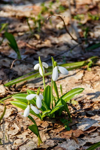 White snowdrop flowers (Galanthus nivalis) in a spring forest