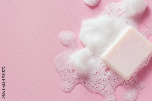 White soap and foam on pink background flat lay with copy space