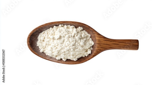 White sodium carbonate powder in a wooden spoon, isolated on a clean background, top view showcasing its fine texture and vibrant color.
