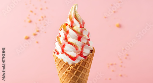 White soft serve ice cream cone with red syrup and gold sprinkles waffle cone dessert