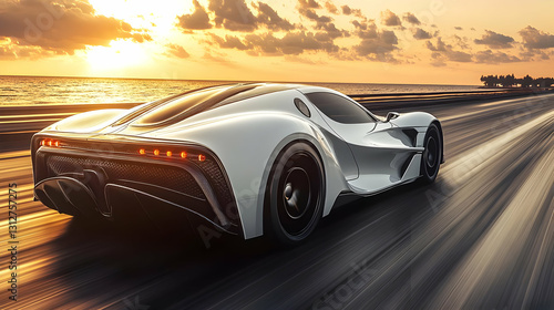 sports car, sunset, beach, road, ocean, motion blur, speed, fast, car, vehicle, transportation, automotive, automobile, powerful, elegant, stylish, modern, design, technology, driving, travel, adventure, horizon, landscape, summer, evening, golden hour, coast, sea, water, sky, cloud, light, warm, dynamic, energy