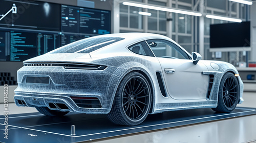 white sports car in a high-tech factory with digital wireframe overlay showing design and engineering details coche deportivo blanco en una fábrica de alta tecnología con un esquema digital