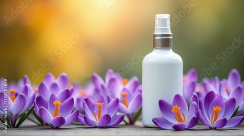 crocus, flower, purple, spring, nature, botanical, fragrance, perfume, cosmetic, skincare, beauty, organic, natural, essence, essential oil, serum, lotion, spray bottle, container, product, wellness, aroma, floral, garden, sunlight, warmth, season, bloom