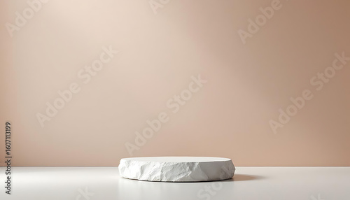 background, beige, stone, white, pedestal, platform, dais, stage, presentation, showcase, texture, minimal, simple, clean, modern, design, abstract, blank, empty, copy space, surface, studio, neutral, colours, smooth, rough, round, circular, display stand, branding, marketing, advertising, commercial, template, illustration, rendering, three-dimensional, scene, pastel, elegant, sophisticated, luxury, light, shadow, wall