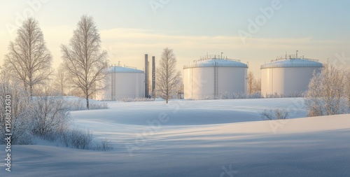 sky, rural, nature, background, blue, view, storage, industry, tank, silos, gas, building, container, steel, white, oil, winter, cold, snow