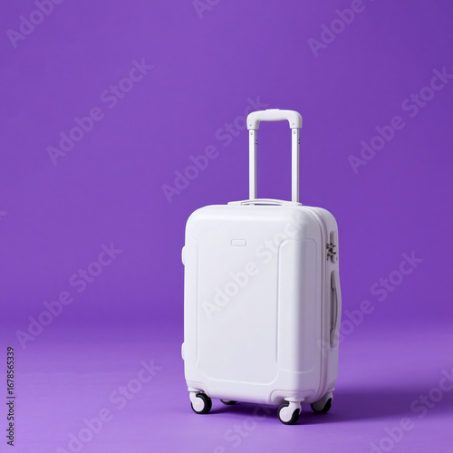 White Suitcase with Telescopic Handle on Solid Purple Background