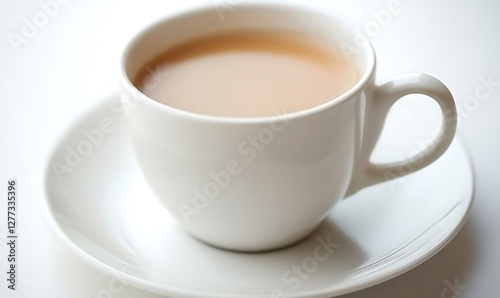 tea, cup, drink, white, still, life, close, up, hot drink, saucer, hot, beverage, teacup, british, english, breakfast, morning, afternoon, asia, china, japan, simple, ceramic, porcelain, clean, empty, full, studio, light, background, table, warm, healthy, relax, relaxation, sharpened, detail, object, photo, image, single
