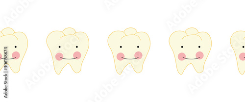 White teeth with smiling face cartoon style seamless vector border. Dental repeating pattern with cute white teeth. Use for kids dentistry, dental clinic advertisement, flyer, card, packaging