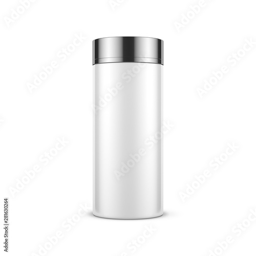 White Tube Tin can Mockup with chrome metal lid, thermos