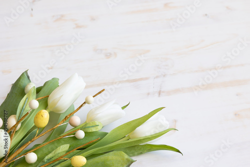 White tulips and decorative branch of easter eggs on a white wood background with copy space