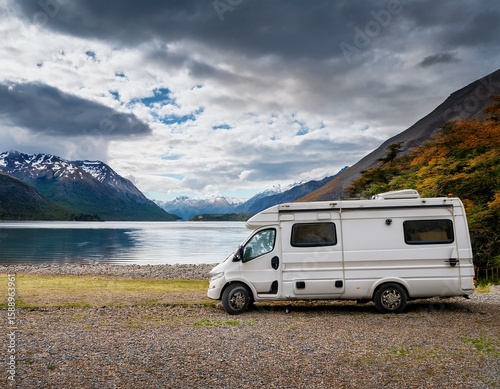 white van motorhome parked near a lake moquehue with mountains in the background under a cloudy sky