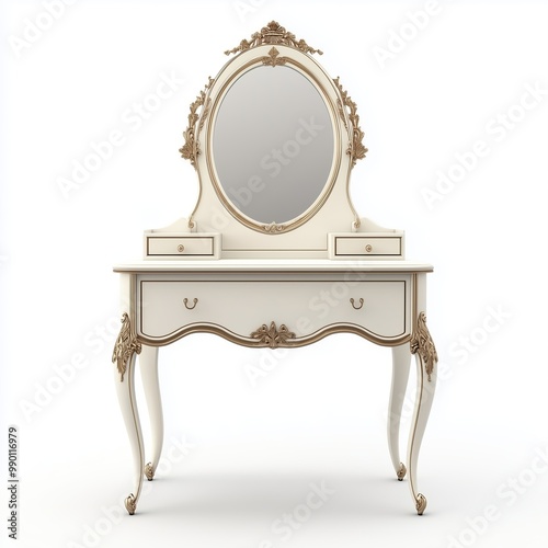 white, vanity, table, mirror, oval, gold, accent, ornate, carved, elegant, feminine, luxurious, bedchamber, furniture, interior design, home decor, beauty, make-up, vintage, antique, classic, traditional, french, rococo, baroque, stylish, modern, contemporary, chic, luxury, glam, glamour, art deco, high-end, upscale, sophisticated, exquisite, graceful