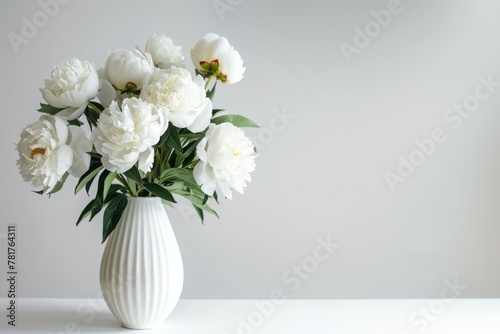 White vase filled with white blooming flowers. Photo of white Peonies in white vase on white background. Space for copyspace.