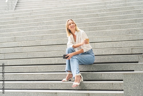 White Woman In Casual Outfits Sitting and Using Phone While Having a Coffee Outdoors