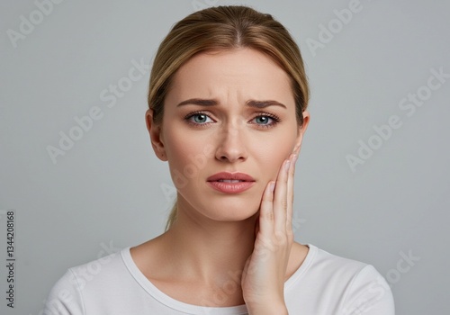 White Woman with Toothache, Touching Cheek in Discomfort