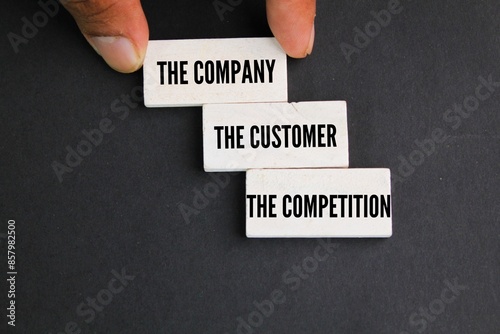 white wood with three words the company, the customer, and the competition. THE THREE Cs STRATEGIC MARKETING