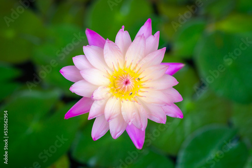 white-pink lotus with yellow stamens and the lotus leaf blurs in the background.
