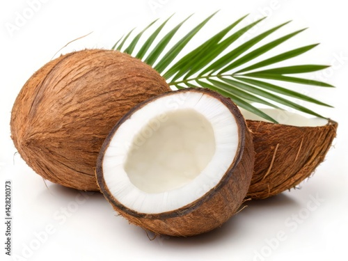 coconut, whole, halved, brown, shell, rough, textured, interior, palm leaf, tropical, fresh, natural, exotic, organic, alimentary, healthy, fruit, food, ingredient, island, beach, summer, hydratation, refreshing, smooth, vibrant, raw, pure, edible, nut, rich, wholesome, culinary, traditional, botanical, agriculture, harvest